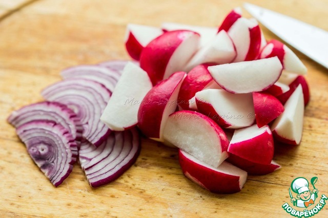 Редиску нарезать дольками на 4 или 8 частей, в зависимости от её размеров. Лук нашинковать полукольцами.