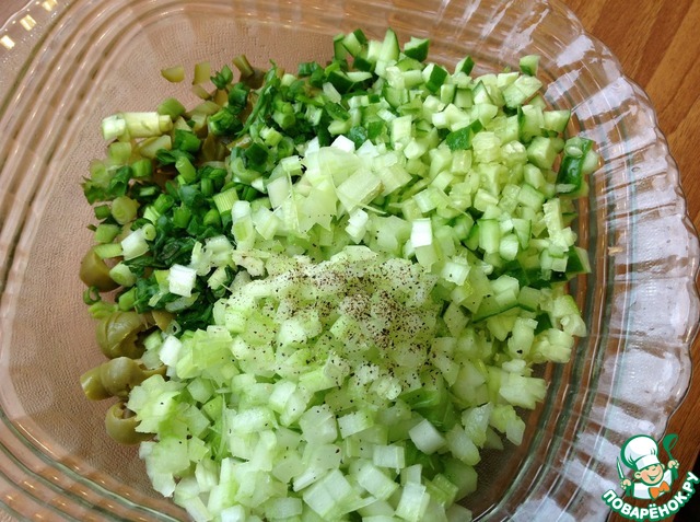 Свежий огурец порезать маленьким кубиком, стебли сельдерея тоже. Зеленый лук мелко нашинковать. Добавить по вкусу свеже молотый черный перец
