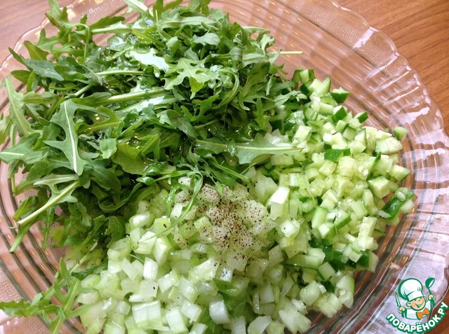 Выложить руколлу и полить оливковым маслом. Аккуратно перемешать. Может красивее будет салат выкладывать на листья руколлы, но мне нравится когда листья руколлы полежат минут 10 в салате со всеми продуктами и впитают в себя все такие замечательные ароматы, и насытятся ими. Поверьте, вкус получается совсем иным, но делайте как вам больше нравится.
