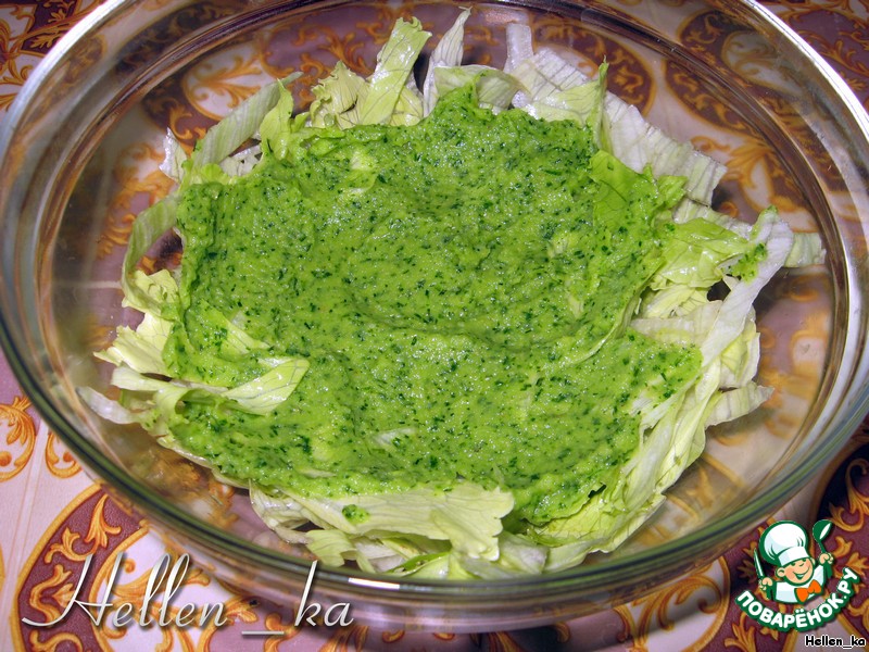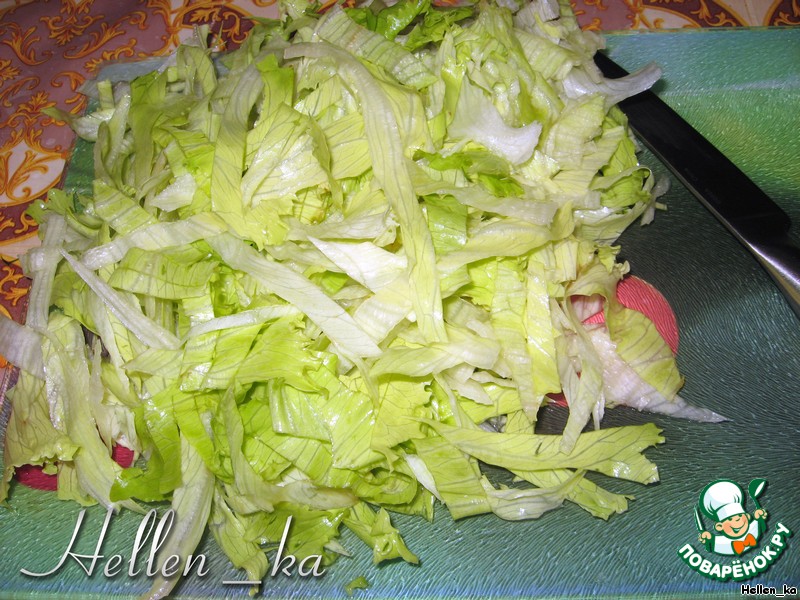 На дно салатника первым слоем выкладываем нарезанный салат Айсберг.