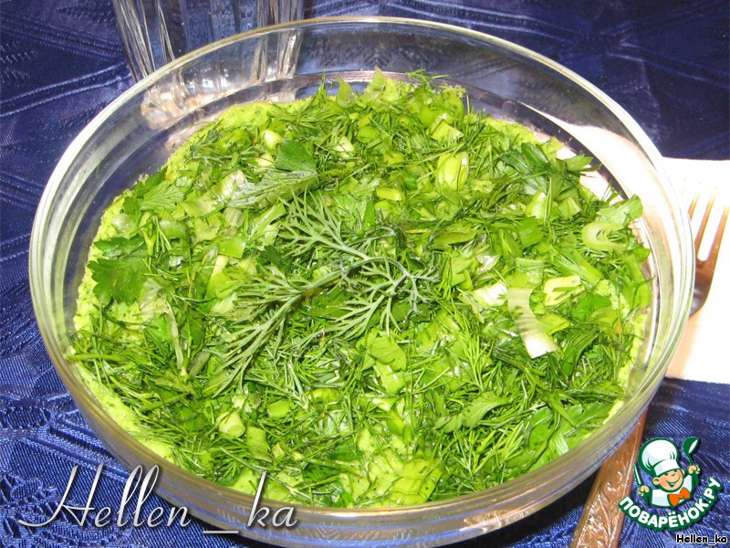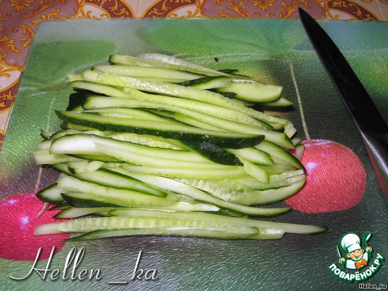Третий слой огурцы. Хорошо смазываем заправкой.