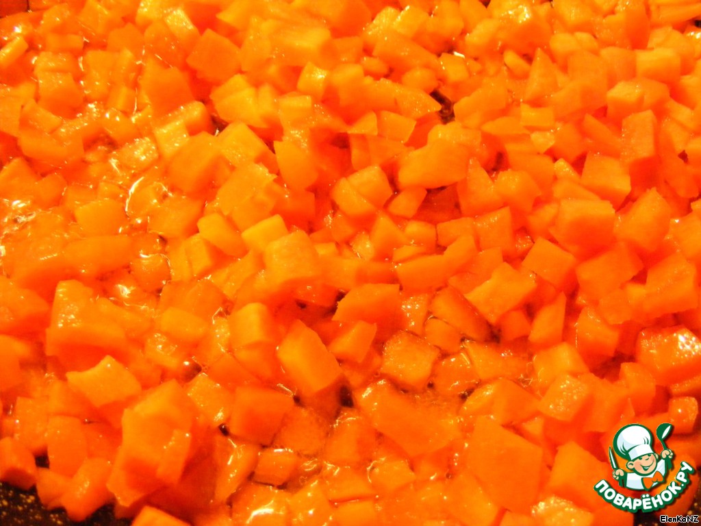 Морковь чистим и режем мелкими кубиками, обжариваем на оливковом масле до мягкости. Шинкуем петрушку и зеленый лук.
