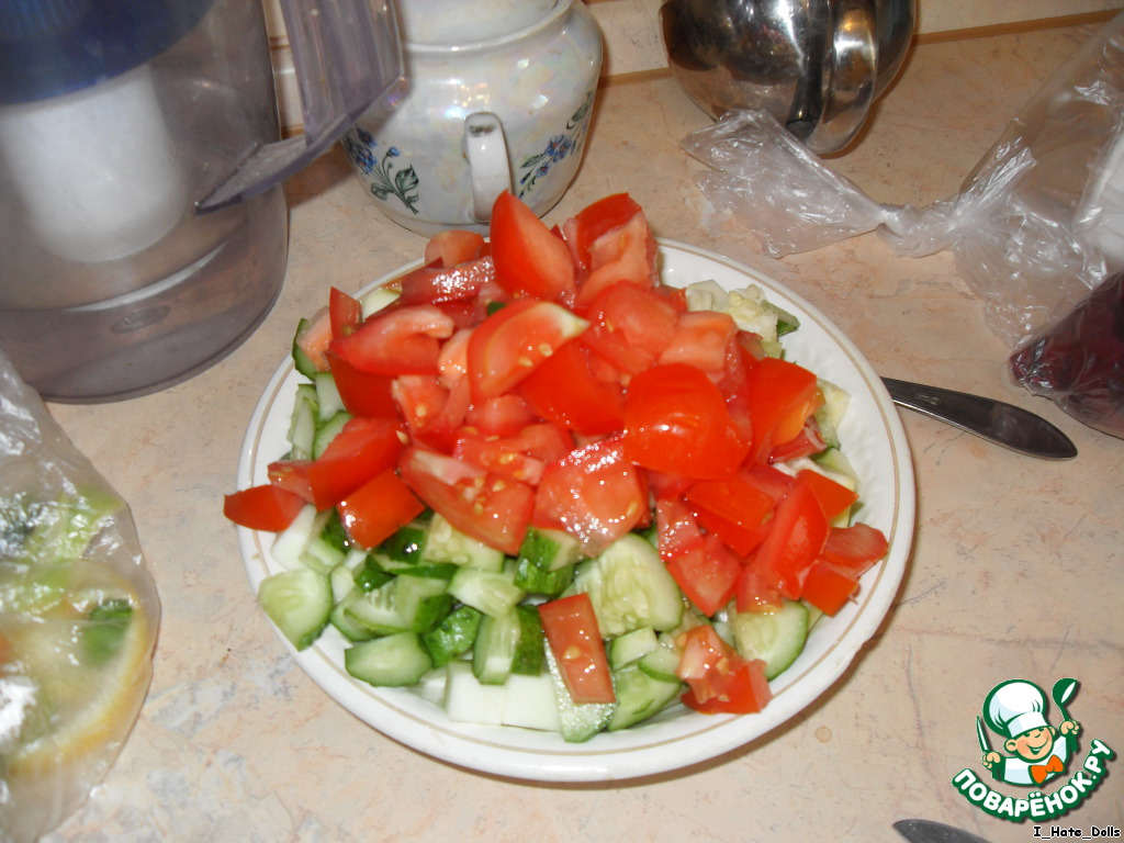 Чистим кабачок, режем кубиками, так же режем кубиками помидоры и огурцы, чистим красный лук (в салат используется 2\\3 луковицы) и нарезаем кольцами, добавляем рубленый чеснок.