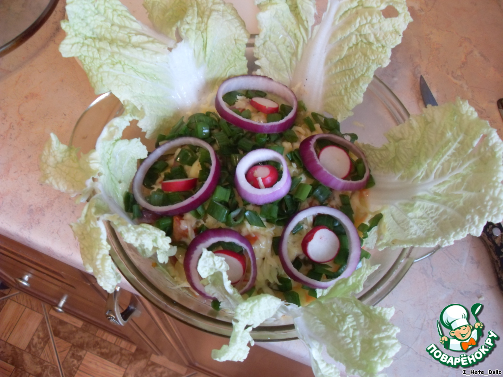 Салатницу украшаем листочками капусты в виде корзиночки, кладем обжаренные в кляре овощи (кляра должно быть немного), сверху трем сыр, украшаем оставшимися кольцами красного лука, нарезанным зеленым луком и кружочками редиса.