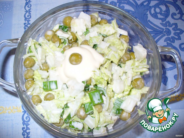 Смешать лук, капусту, зеленый горошек, заправить майонезом, посолить по вкусу! Всё!