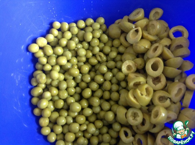 Слить лишнюю жидкость с горошка, оливки порезать колечками
