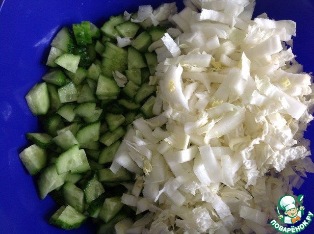 Огурцы нарезать кубиком, капусту нашинковать достаточно мелко