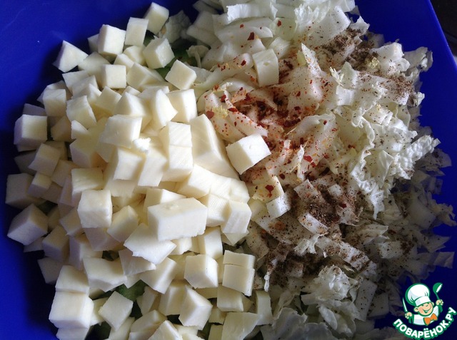 Добавить специи, нашинкованный укроп и сыр порезанный мелким кубиком