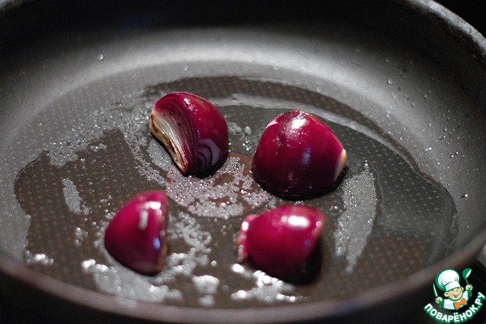 На разогретой сковороде, с растительным маслом, обжарить красный лук, нарезанный на дольки/четвертинки. Уменьшить огонь, готовить еще 4-5 минут.