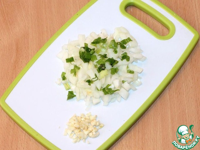 Репчатый лук нарезать небольшими кубиками, чеснок мелко порубить.