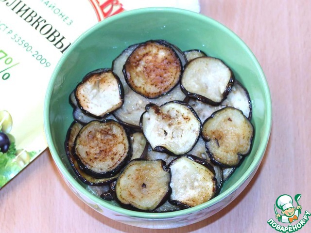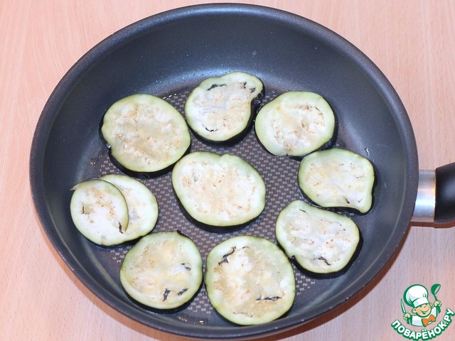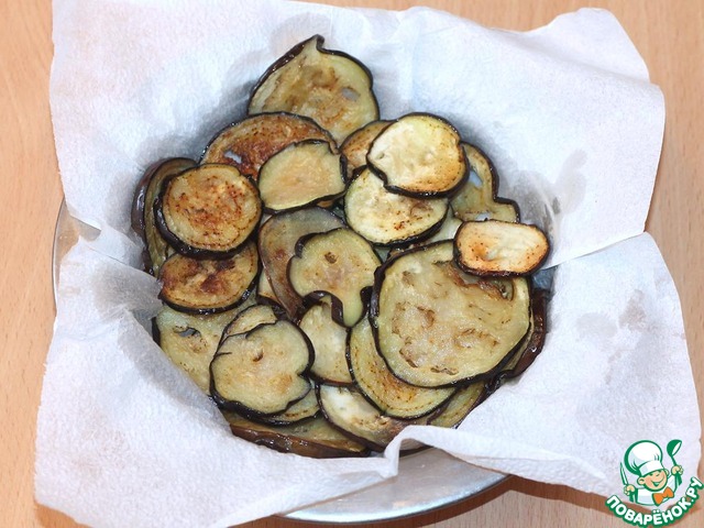 Баклажан промыть нарезать кружочками толщиной в 0,5 см. Посолить и отставить в сторону на 15 минут.