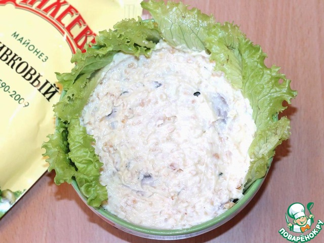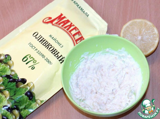 Приготовить соус, соединив майонез, измельчённый чеснок, лимонный сок, соль, толчёные орехи.