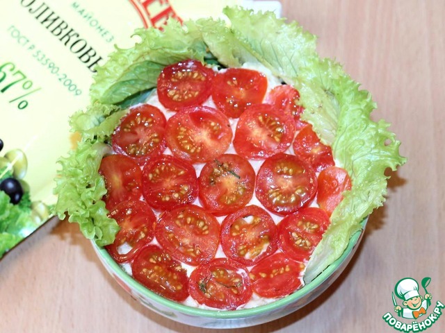 и сверху — помидоры, нарезанные кружочками. Поперчить смесью перцев.