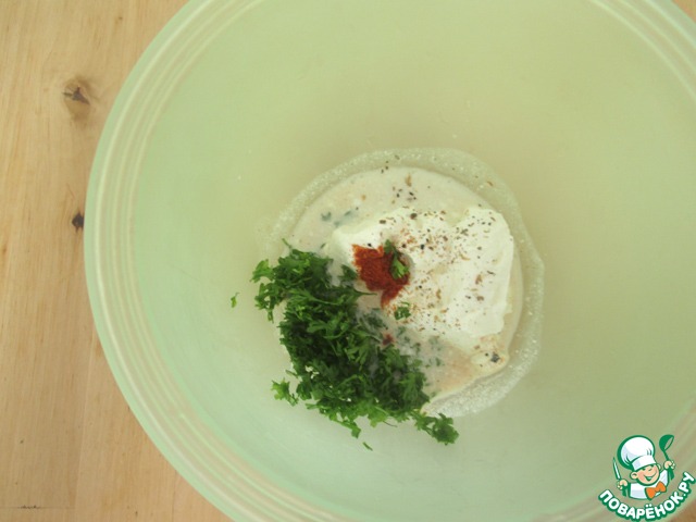 Тем временем в глубокой посуде смешать сметану, уксус, мелко нарезанную петрушку, перец красный жгучий, немного соли и немного черного перца. Осторожно со жгучим перцем, я рекомендую добавить сначала меньше указанного количества, а в конце приготовления, при необходимости, добавить еще.