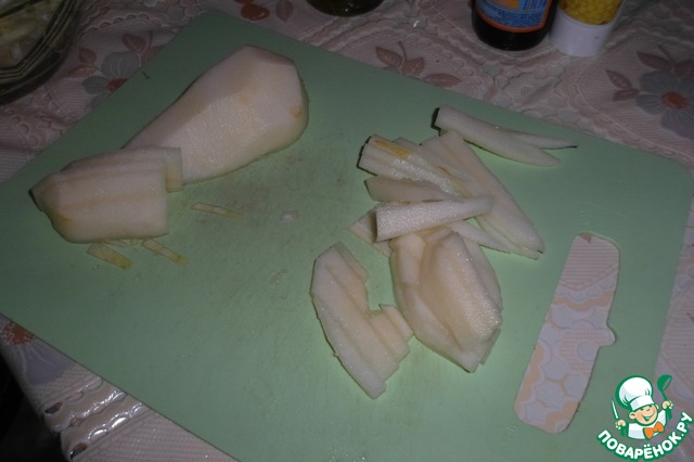 | Увидел в магазине салатный цикорий и приготовил салатик с ним. Жене так понравилось, что она периодически его делает, внося каждый раз новшества в рецепт. Благо салатный цикорий - необычный салат, который в сочетании с разными овощами и фруктами, приобретает различные вкусовые оттенки. А сколько в нем полезностей! У меня классика: салатный цикорий + груша. |