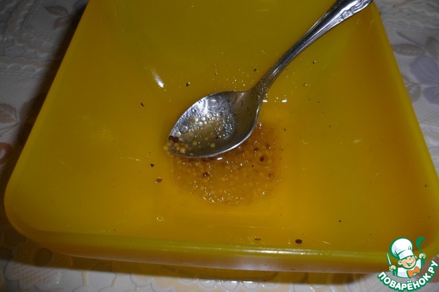 5. Для заправки смешаем мед, яблочный уксус, ореховое масло, горчицу. Соль и перец добавляем по вкусу. Перемешиваем пока не растворится мед. Даем постоять 5 минут.