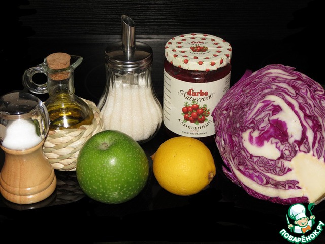 Для салата понадобится: капуста, яблоко, клюквенный соус, сахар, соль, масло, лимон.