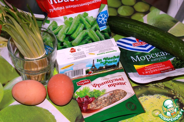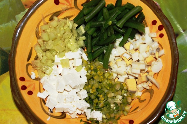 Фасоль стручковую бланшировать в кипящей воде, откинуть на дуршлаг и погрузить в воду со льдом для сохранения ярко-зеленого цвета.