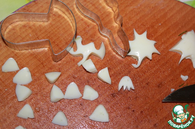 Из яичного белка вырезать заготовки цветов ландыша при помощи формочек или острым ножом.