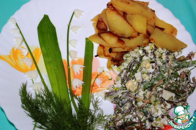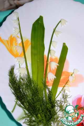 Украсить блюдо, сформировав листья ландыша из черемши, стебельки из стеблей укропа и на стебельки высадить цветочки из белка.