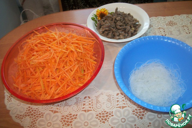 Морковь почистить, натереть на тёрке для корейской моркови. Фунчозу залить кипятком на 2 минуты, после чего промыть и порвать помельче, добавить к моркови. Туда же высыпать приправу для моркови по-корейски, всё перемешать.