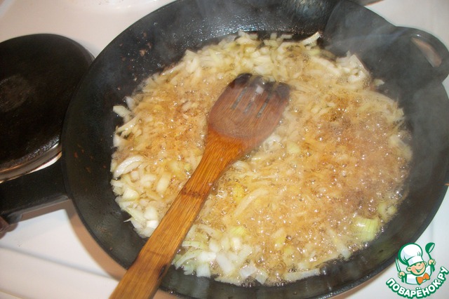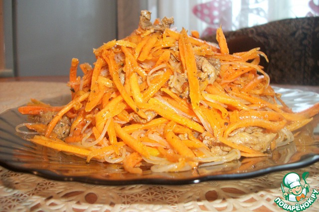 Мясо порезать тонкой соломкой, лук мелко порубить. На раскалённую сковороду налить немного растительного масла. Закинуть мясо, обжарить (мясо готовится очень быстро). Снять, остудить, добавить к моркови.
