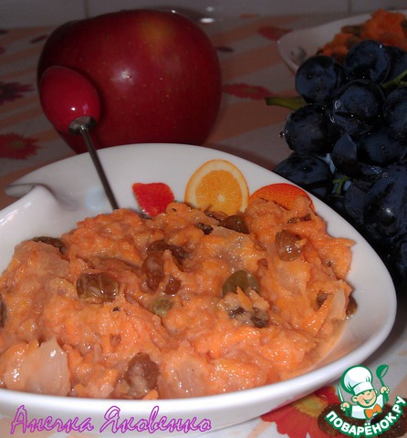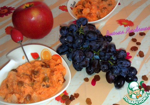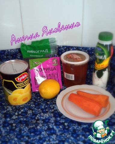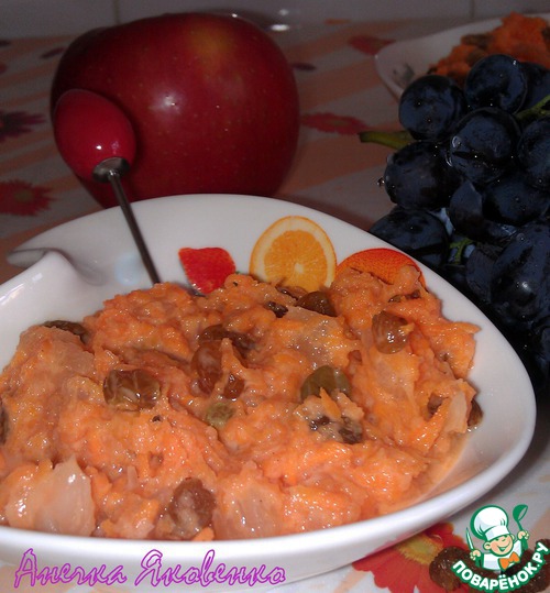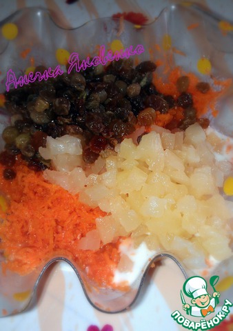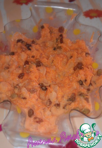 1/2 стакана изюма заливаем кипятком, чтобы он быстро распарился, ждем пару минуток, процеживаем и добавляем изюм в салатник...