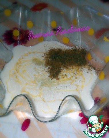 Сначала делаем заправку... наливаем в салатник 1/2 стакана йогурта (желательно брать обезжиренный йогурт, меньше калорий в салате будет, но у нас с таким йогуртом последнее время дефицит какой-то, у меня в данном случае жирность 2,4%), добавляем 1 ст. л. лимонного сока, щепотку корицы и мед (по рецепту вообще советуют добавить 1 ст. л., но по мне, это очень много выходит, очень сладко, я добавила 0,5 ст. л.)... перемешиваем...