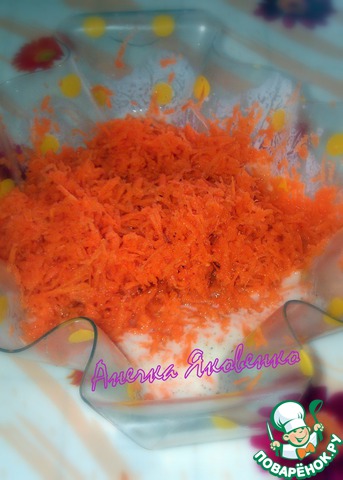 Трем морковку на мелкой терке, либо на специальной плоской терке для моркови и добавляем в салатник...