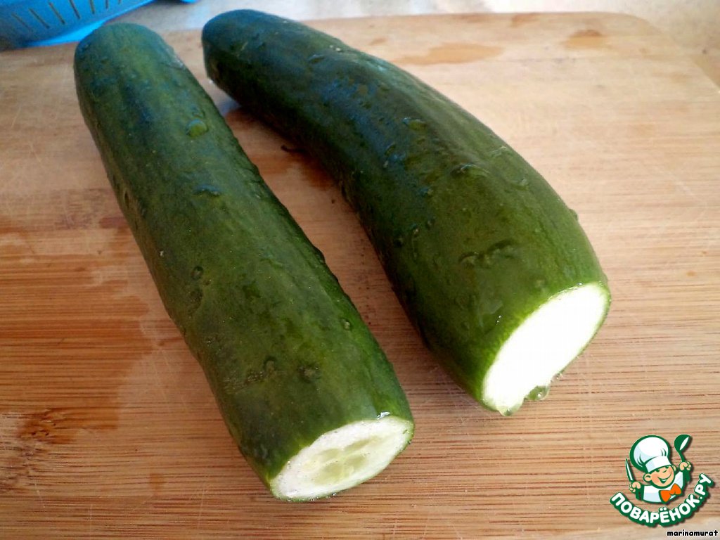 Из минимума ингредиентов можно приготовить отличный салат и подавать либо как самостоятельное блюдо, либо как гарнир к мясу, рыбе. Нам нужны 2 огурца. Режем их на колечки тонкие. Кожицу можете снять, если она не внушает доверия.