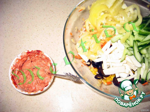 | Овощной микс из морковочки, огурчика, перчика, кукурузки с добавлением яблочка, оливок и брынзы... заправка из чеснока, томатной пасты, сливочного сыра со вкусом бекона и немного зелени |