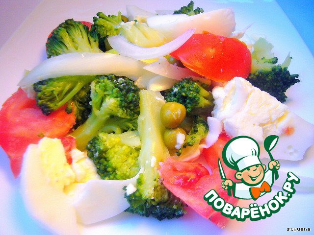 Крупно нарезаем помидор, режем вдоль лук, добавляем разделенные на соцветия брокколи и порезанные на 8 частей вдоль яйца, высыпаем зеленый горошек и заправляем майонезом.