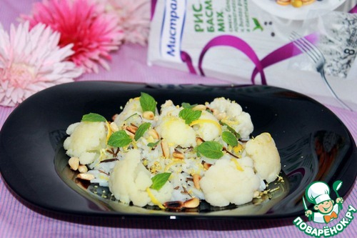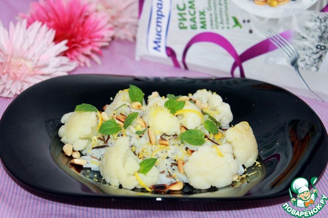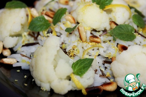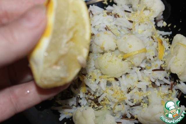 На тарелку выложить горкой рис, на него отваренную цветную капусту, присыпать лимонной цедрой, полить лимонным соком, сбрызнуть оливковым маслом