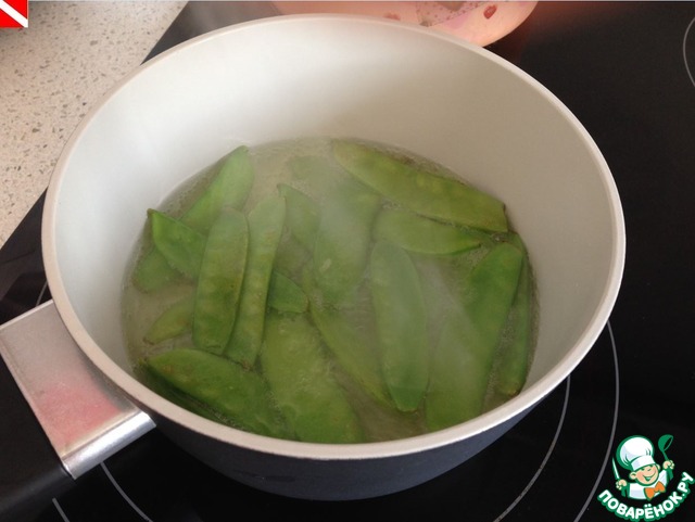 В сотейнике доводим до кипения воду и опускаем в нее сахарных горошек на 1-2 минуты