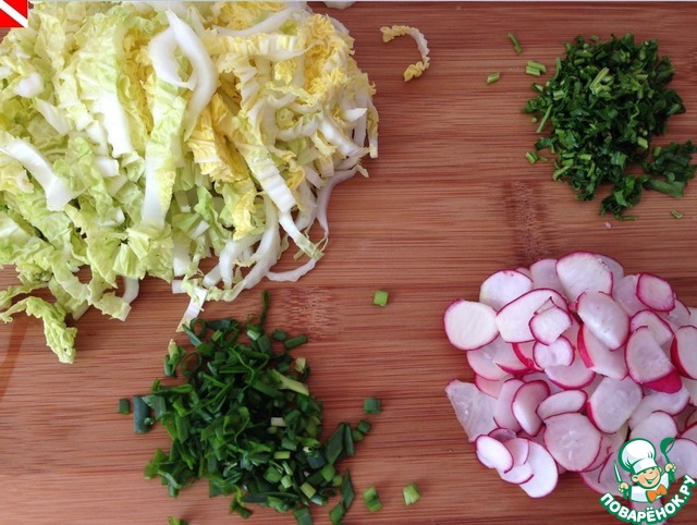 Произвольно нарезаем остальные овощи: пекинскую капусту, редис, зеленый лук и петрушку