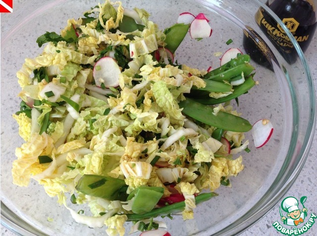 | Впервые увидела у нас в продаже сахарный горох, сразу вспомнился салатик с какого-то американского сайта (недаром столько ждал своей очереди) с одноименным названием Napa Cabbage Picnic Salad. Что ж, попробуем! |