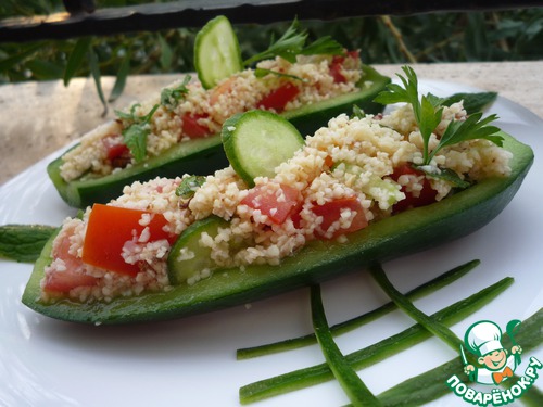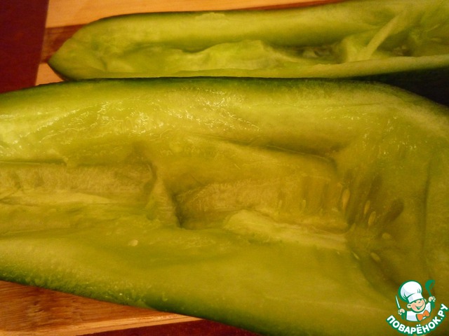 Подготовим огурец, чтобы заправить в него салат. Разрезаем огурец вдоль, вырезаем мякоть.