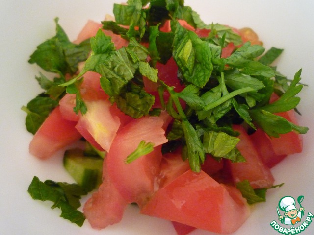 Также мелко режем петрушку, мяту. Добавляем к овощам