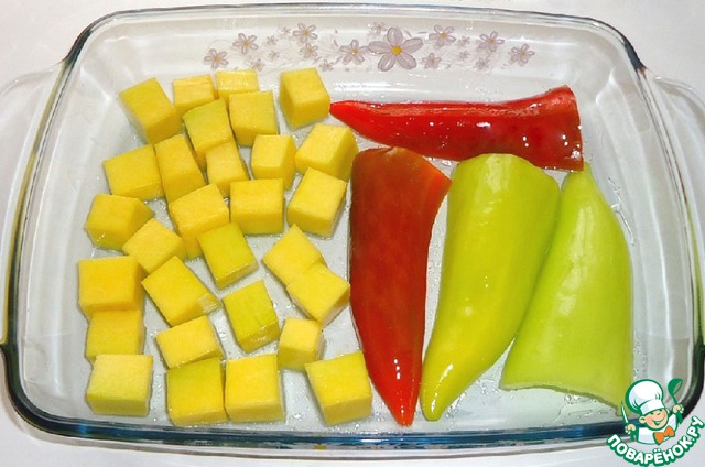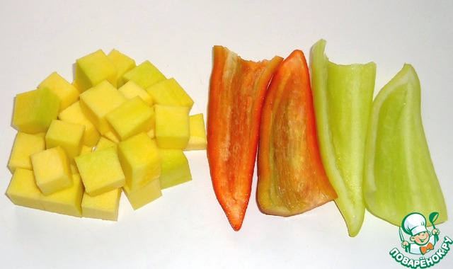 Тыкву очистить от кожуры и семян, нарезать на небольшие кубики одинакового размера. Болгарский перец разрезать пополам, очистить от семян.