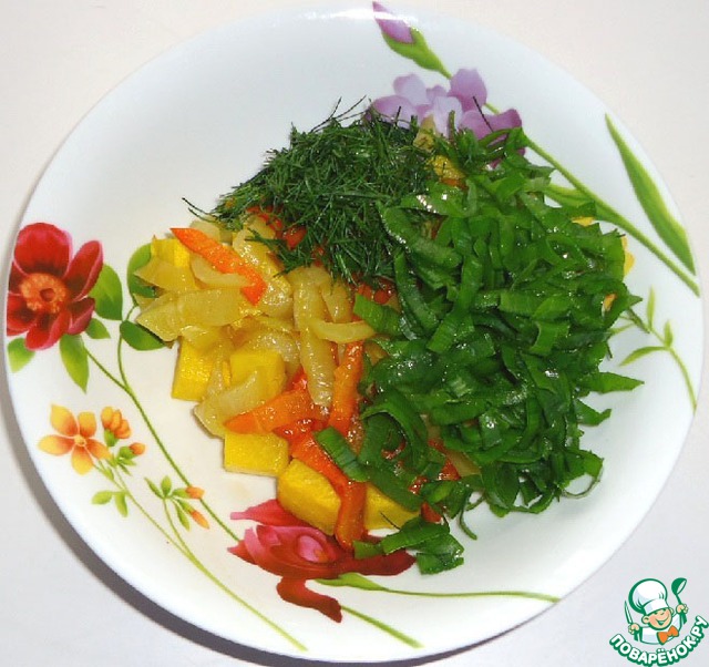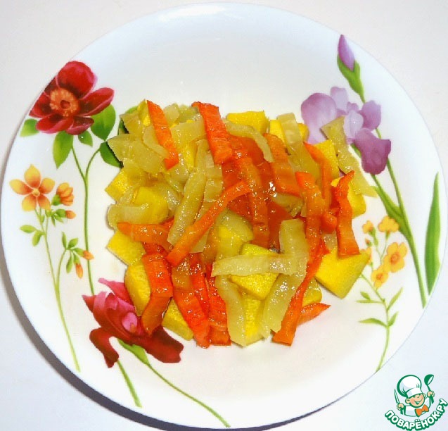 Печеную тыкву и нарезанный печеный болгарский перец сложить в салатник.