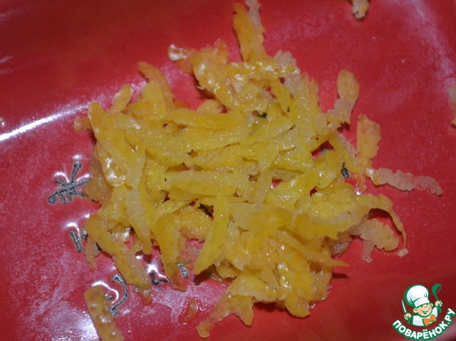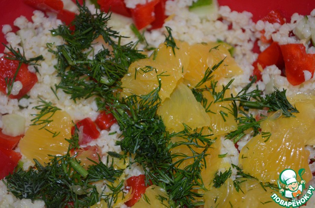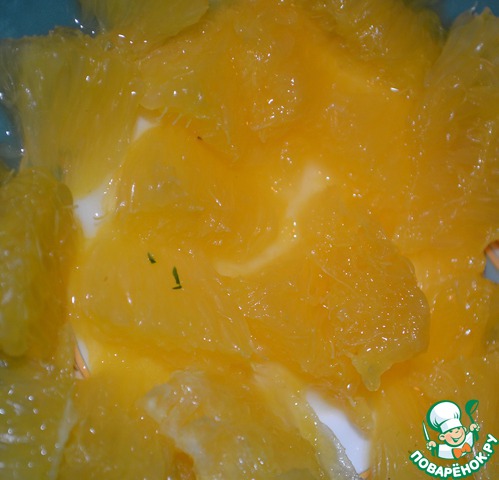 Далее добавляем апельсин и его сок, который выделился когда мы его чистили. В последнюю очередь добавляем мелко нарезанный укроп.