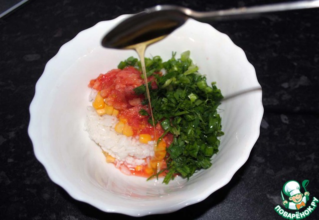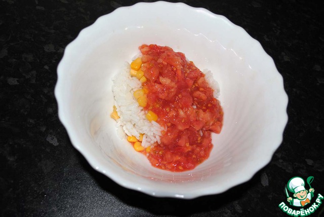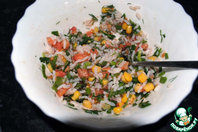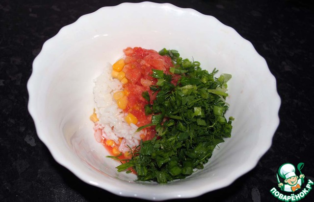 Все хорошо перемешиваем и фаршируем помидоры.