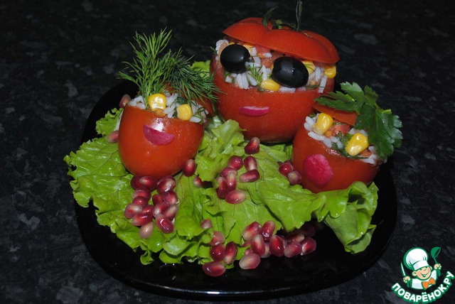 Готовую семью кладем на зеленый лист салата и украшаем гранатом. Для создания глаз я использовала кукурузу и маслины, а рот сделала из редиса.