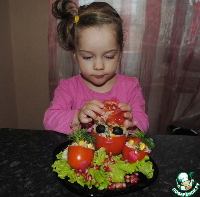 Ну вот мой маленький дегустатор, проверяет, что же там под шапочкой помидорыча. Приятного аппетита!