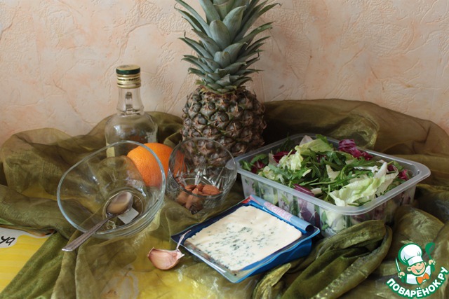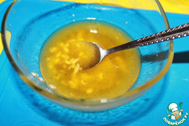 Теперь приготовим заправку. Для этого в пиалке смешаем 1 зубчик измельчённого чеснока, 1 ст л оливкового масла, 1 ст л лимонного сока, 1 ст л ананасового сока (я делала фреш), 1 ст л апельсинового сока (также использовала фреш), 1 ч л жидкого мёда, щепотку соли и чёрного перца. Всё хорошенько перемешать.