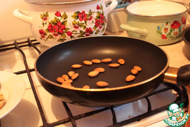 Первым делом- подсушим хорошую горсть миндаля на сковороде ( минут 5 на небольшом огне). Подсушенный миндаль высыпаем на полотенце, прикрываем ещё одним полотенчиком и бьём скалкой, чтобы получилась крупная крошка.