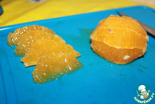 Теперь приступим к самой длинной процедуре))). Шучу. С апельсина снимем кожуру с перепонками, филируем дольки апельсина, очищая от семян и перестенок.