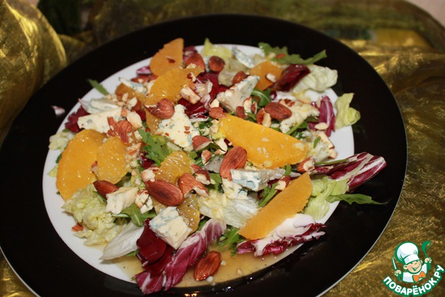 Собираем наш салатик. На плоскую тарелку выкладываем листья салата, рукколу, филе апельсина, некрупно руками ломаем наш сыр, выкладываем измельченный миндаль, поливаем заправкой и вуаля!!! Вкуснейший салат готов))). Очень рекомендую попробовать. Приятного аппетита.