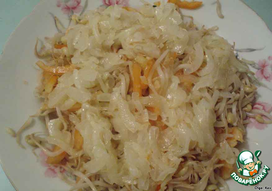 Проростки переложить в тарелку и смешать с нарезанным перцем.