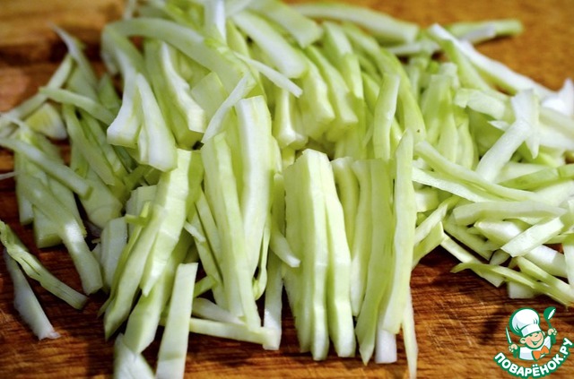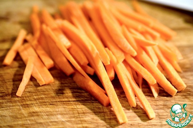 Морковь очистите и нарежьте длинной соломкой как можно тоньше.